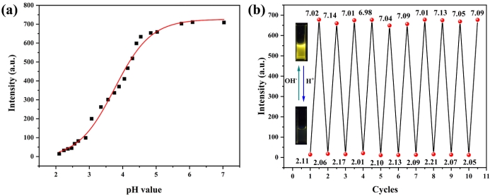 图2 (a)荧光发射强度与pH值的关系图(红色实线是使用玻尔兹曼方程拟合数据获得的;(b)十个荧光循环周期(顶部:pH = ~7.0;底部:pH = ~2.1)。