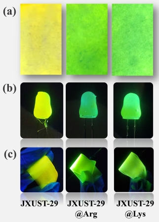 图3 (a)JXUST-29JXUST-29@Arg和JXUST-29@Lys在波长为365 nm的紫外光下的荧光试纸。(b)在365 nm激发下涂有JXUST-29JXUST-29@Arg和JXUST-29@Lys的LED灯;(c)在365 nm的紫外光下基于JXUST-29JXUST-29@Arg和JXUST-29@Lys的复合膜。