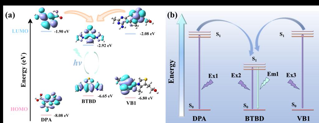 图4. 在PBE0/def2-SVP水平计算的DPA、BTBD和VB1的HOMO和LUMO能级;(b) DPA、VB1和BTBD之间的单重态能量转移过程。