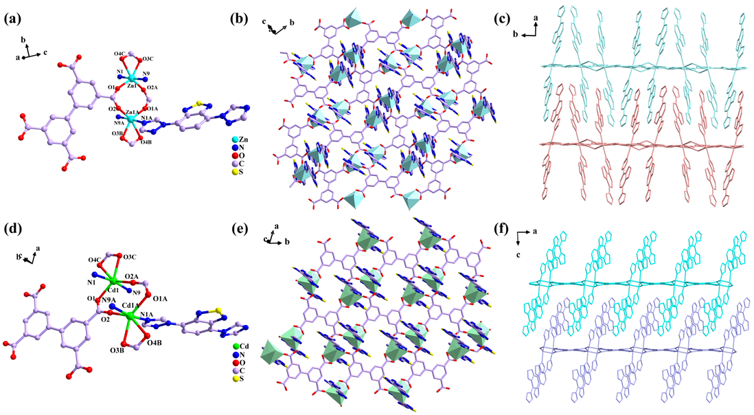 在这项工作中,刘遂军教授课题组通过H4bptc与具有大π共轭体系和强吸电子特性的苯并噻二唑衍生物(BTBD)成功构筑了两个结构相似的二维层状MOF荧光传感器,即{[M(BTBD)2(bptc)0.5]·H2O}n(M = Zn(JXUST-48)和Cd(JXUST-49)),他们具有优异水稳定性、pH稳定性和溶剂稳定性。值得注意的是,JXUST-48和JXUST-49对生物标志物DPA和生物分子VB1均展现出高灵敏度的荧光开启效应。