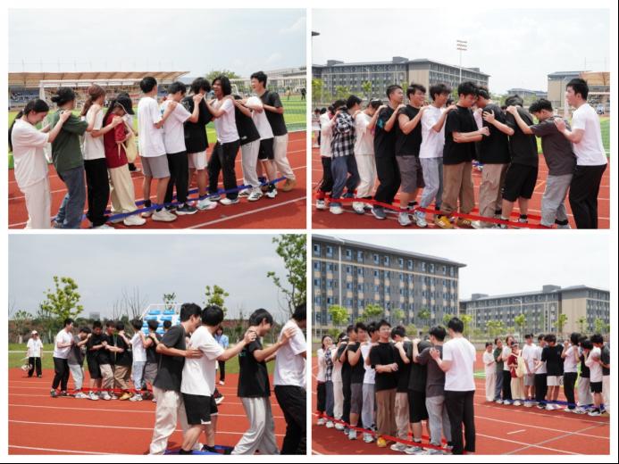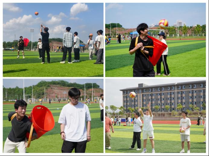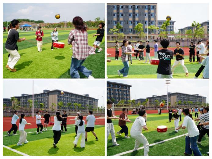 紧接着,各项趣味活动轮番登场。“同炉共进”环节,同学们绑足搭肩、步调一致,在并肩前行中培养默契,欢笑声此起彼伏;另一边的“钨金战鼓”现场,大家凝神聚力、密切配合,在轻松有序的节奏中体验同心协力的喜悦。再看“金石投趣”,选手们精准投掷、轻松上阵,在趣味互动中释放压力,展现出积极乐观的参与状态。