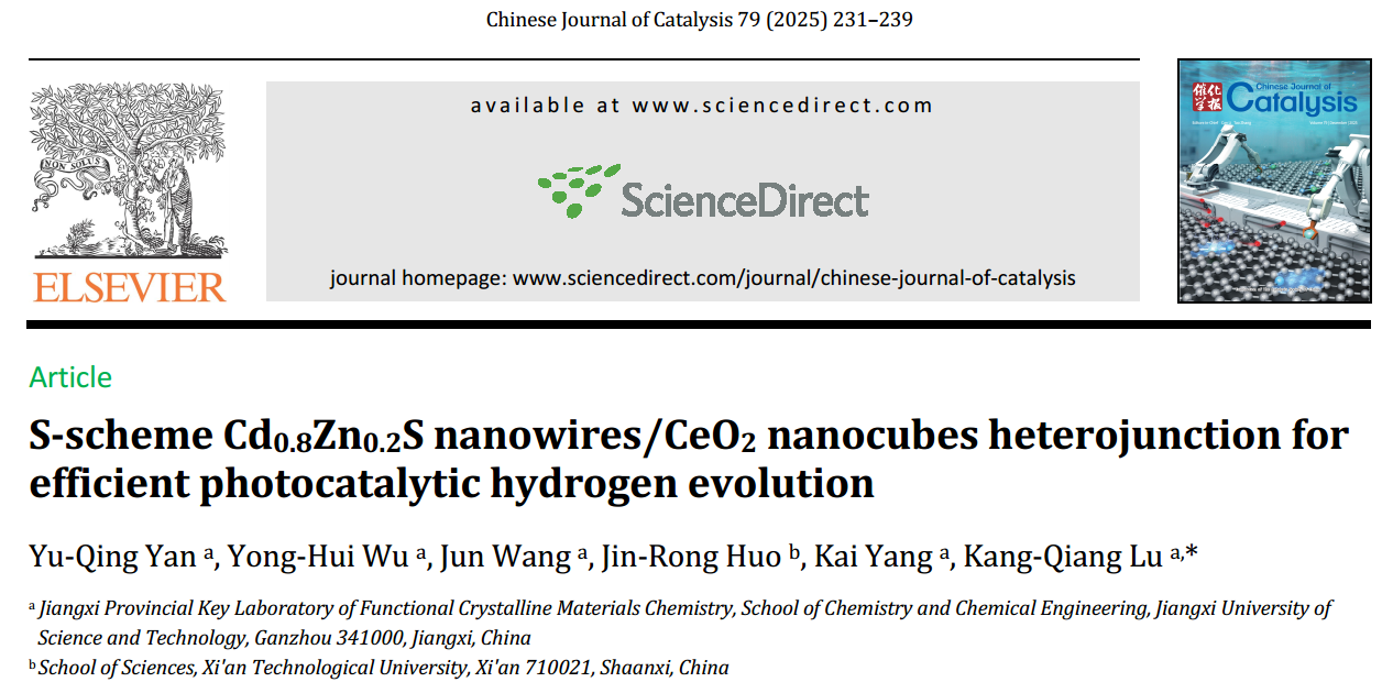 本网讯 近日,化学化工学院(功能晶态材料化学江西省重点实验室)卢康强副教授课题组的研究论文“S-scheme Cd0.8Zn0.2S nanowires/CeO2nanocubes heterojunction for efficient photocatalytic hydrogen evolution”在化学领域权威期刊《Chinese Journal of Catalysis》(SCI一区Top期刊,影响因子17.7)公开发表,论文第一作者为江西理工大学化学化工学院2021级本科生鄢雨晴,论文内容源自其本科毕业论文,通讯作者为卢康强副教授。