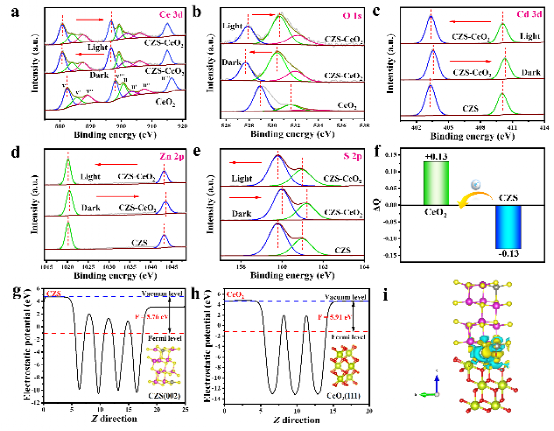 图 4.CZS-CeO2复合材料的(a)Ce 3d、(b)O 1s、(c)Cd 3d、(d)Zn 2p和(e)S 2p的原位X射线光电子能谱图。(f)CZS-15%CeO2复合材料的Bader电荷计算。(g)CZS(002)和(h)CeO2(111)晶面的静电势计算值。(i)CZS-CeO2异质结的差分电荷密度。