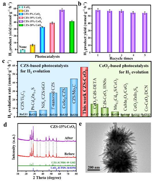 图3.(a)CZS、CeO2和不同比例的CZS-CeO2复合材料的光催化产氢活性图。(b)CZS-15%CeO2复合材料的光催化产氢稳定性图。(c)CZS-15%CeO2与已报道的其他材料的产氢活性对比图。(d)光催化产氢测试后的CZS-15%CeO2的XRD图谱。(e)催化产氢测试后的CZS-15%CeO2的TEM图像。