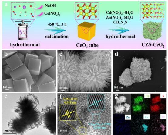 CZS-CeO2异质结的合成示意图如图2(a)所示。通过扫描电子显微镜(SEM)和透射电子显微镜(TEM)鉴定了所制备样品的结构和形态。可以看出,CeO2为纳米立方体结构,CZS为纳米线结构,二者紧密接触。此外,如图2(g)所示,CZS-CeO2的元素映射图像显示Cd、S、Zn、Ce和O元素在整个结构中均匀分布,这表明CZS在CeO2纳米管表面上的分布均匀。