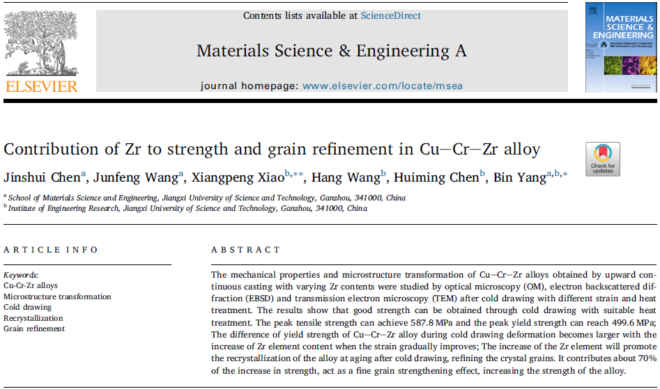 《Contribution of Zr to strength and grain refinement in Cu-Cr-Zr alloy》Cu-Cr-Zr合金中Zr元素对强度和晶粒细化的贡献
