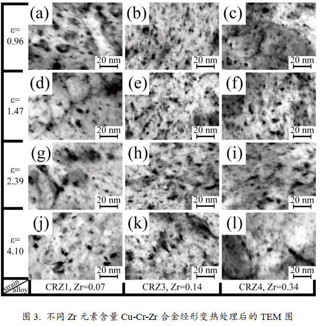 随着高铁技术和电子信息产业的快速发展,高强高导铜合金的强化机理一直是研究的热点问题之一。目前研究人员已通过各种方式来获得更加优异的合金组织和性能,如添加微合金元素增加析出强化效果;采用等通道转角挤压、多向锻造、高压扭转等大变形量塑性变形方法来提高应变强化和细晶强化的作用。但在形变热处理过程中,Cu-Cr-Zr合金中Zr元素对组织和性能的影响尚未完全明确,析出强化、细晶强化、应变强化、固溶强化等强化方式所占的比例也还不明确。近日,江西理工大学研究人员选取不同Zr元素含量的Cu-Cr-Zr合金为研究对象,系统的研究了该合金中Zr元素对组织和性能的影响规律,重点分析了Zr元素对Cu-Cr-Zr合金在形变热处理过程中晶粒大小和强度差值增量的贡献。